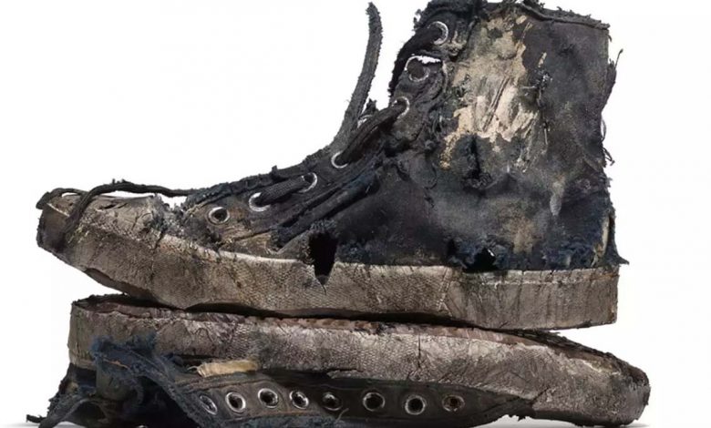 Torn, dirty, but for sale for $1,850. The luxury brand Balenciaga launched a worn version of its Paris High Top…