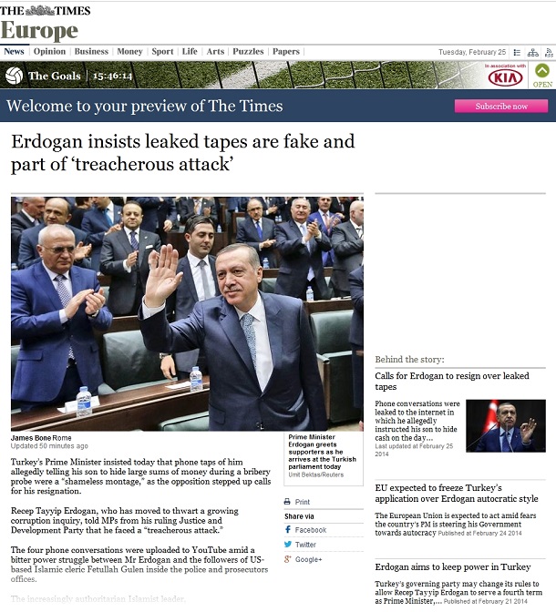 Bu arada Dünya’nın ve İngiltere’nin en saygın gazetelerinde biri olan The Times ise başlığında ” Erdoğan sızan telefon kayıtlarının sahte olduğunu ısrarla iddia etmeye devam ediyor” başlığı ile haberi gündemine aldı. Makalede ayrıca YouTube’de yayınlanan kayıtların son 24 saat içinde en çok hit alan video olduğunu da söyledi.