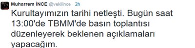 Muharrem İnce’nin Kemal Kılıçdaroğlu’na yaptığı kurultay çağrısı sonrasında,CHP grup başkanvekilliğinden istifa edeceğini beyan eden İnce,Twitter’dan yaptığı açıklamayla,saat 13.00’da basın toplantısı yapacak.